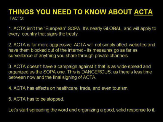 Kiosk Jutarnji.hr, Novilist.hrI dok se bura oko spornih zakona SOPA-e i PIPA-e u Sjedinjenim Američkim Državama stišava, Europska bi unija kasnije ovog tjedna trebala započeti s radom na ratifikaciji svog globalnog zakona za zaštiti intelektualnog vlasništva - Anti-krivotvoriteljski trgovinski sporazum (Anti-Counterfeiting Trade Agreement), piše Siliconrepublic. Europske države, među kojima je i Irska, kasnije ovog tjedna pridružit će se SAD-u, Australiji, Južnoj Koreji, Novom Zelandu, Jordanu, Maroku, Singapuru, Ujedinjenim Arapskim Emiratima i Kanadi u pružanju podrške ACTA-
