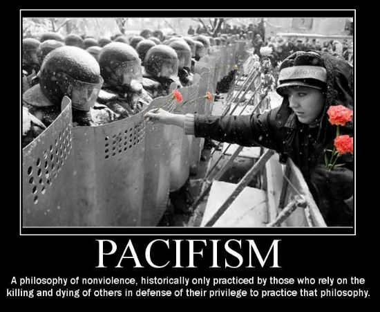 Odbacivanje pacifizma ne znači da sam „za“ nasilje. Poput većine prisebnih ljudi, osobno mrzim nasilje. Ali poput 99.999…% čovječanstva, vjerujem da je nasilje ponekad opravdano, posebice u obrani protiv nasilja drugih. Vjerujem da postoje dvije osnovne programske slabosti u pacifizmu: nenasilje ne „pali“ uvijek i neki sukobi su nepomirljivi.