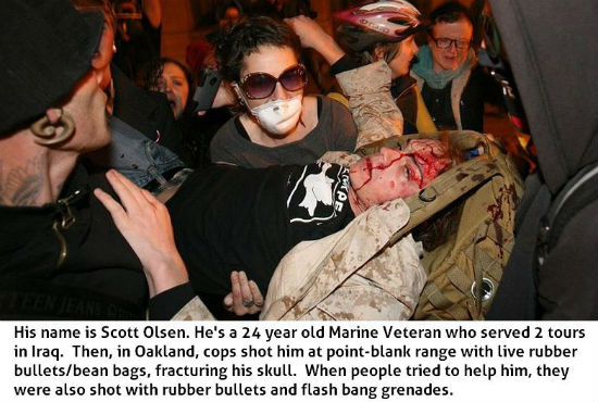 Pamflet Sabo TabiScott Olsen, 24-godišnji marinac, u kritičnom stanju je prevezen u bolnicu nakon što je pogođen kanisterom suzavca u glavu. On se nepovređen vratio iz Iraka gde je služio (u dva navrata i to, kako kaže, nevoljno) interesima američke Imperije. Razvejanih iluzija napustio je vojsku 2010. i uključio se u antiratni pokret. Kao jedan od učesnika pokreta "Occupy Oakland", pretrpeo je ozbiljnu povredu glave pošto je pogođen direktnim hicem iz puške za ispaljivanje kanistera sa suzavcem - što je zakonom zabranjeno (policajci su obabezni da suzavac ispaljuju u luku da bi se izbegle upravo ovakve situacije).