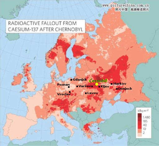 Prostiranje i koncentracija cezijuma-137 na teritoriji Evrope, oslobođenog prilikom eksplozije nuklearnog reaktora u Černobilu, i lokacije stadiona na kojima će biti održan Euro 2012. Vreme poluraspada cezijuma-137 je oko 30,17 godina. Nesreća u Černobilu se desila pre 26 godina. Cezijum-137 je samo jedan od mnoštva radioaktivnih izotopa različitog trajanja poluraspada (u rasponu od par sekundi do više miliona godina) koji su oslobođeni prilikom černobilske nesreće [/caption]