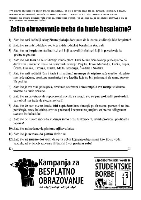 Švedska, Finska, Mađarska, Češka...su samo neke od zemalja u kojima ne postoje školarine na državnim fakultetima, dok su iste u Danskoj recimo zakonom zabranjene. Školarina na Sorboni pak košta nešto više od 500 evra na godišnjem nivou, dok je prosečna plata u Francuskoj preko 1500 evra. Prosečna plata u Srbiji je oko 300 evra a školarina na Filozfskom oko 1200 evra. Smešna je argumentacija pojedinih političara da zahtev za besplatnim obrazovanjem znači povratak u ''totalitarni boljševizam'' ili beg u neki imaginarni utopizam. Vreme je za jednu artikulisanu kritiku ovakvog diskursa i organizuvanu borbu protiv ekonomizacije svih sfera društva, uključujući i obrazovanje. Obrazovanje je ljudsko i društveno pravo. Poslednjih godina, sa uvođenjem neoliberalnih reformi na Univerzitetu, vrata visokog školstva su gotovo potpuno zatvorena za decu koja dolaze iz seljačkih i radničkih porodica. Ovi podaci dovoljno govore o skandalozno niskom stepenu pravednosti aktuelne organizacije društvenog života u Srbiji uzimajući u obzir čak i onaj minimalistički liberalni indikator pravde koji se iskazuje kroz sintagmu.: ''jednakost šansi za sve''.